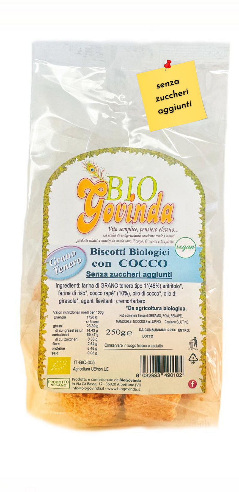 Ingredienti: farina integrale di grano tenero tipo 1* (46%), eritritolo*, farina di riso*, cocco rapè* (10%), olio di cocco*, olio di girasole *, agenti lievitanti: cremortartaro. (*Biologico)