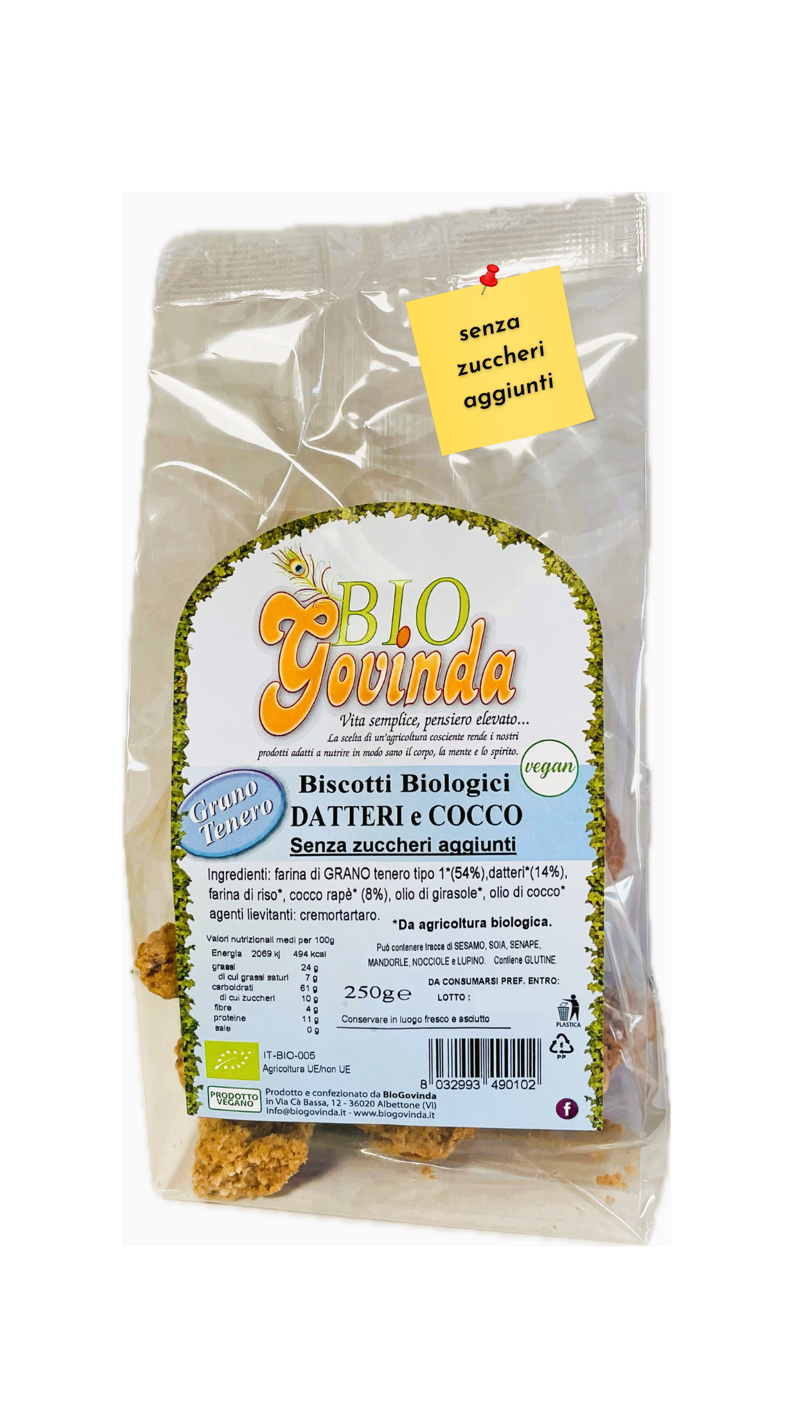 Ingredienti: farina integrale di grano tenero tipo 1* (54%), datteri(14%)*, farina di riso*, cocco rapè* (8%), olio di girasole*, olio di cocco*, agenti lievitanti: cremortartaro. (*Biologico)
