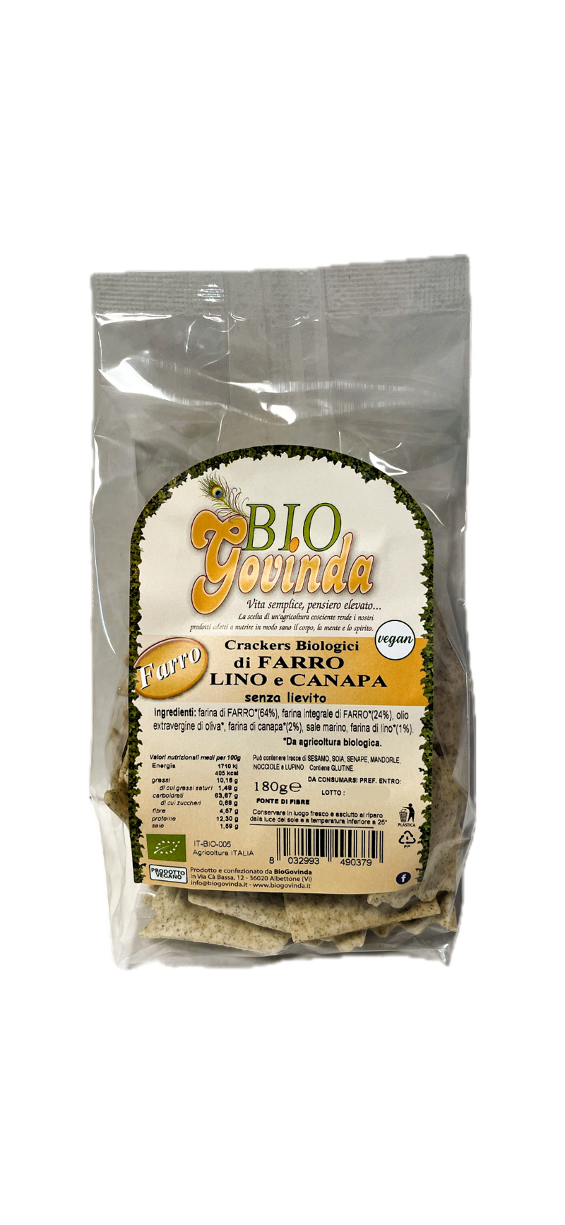 I Crackers di farro senza lievito sono delle golose sfoglie croccanti, leggermente dorate, dal gusto delicato di olio extravergine, arricchite con semi di lino e farina di canapa. Ideale per aperitivi.