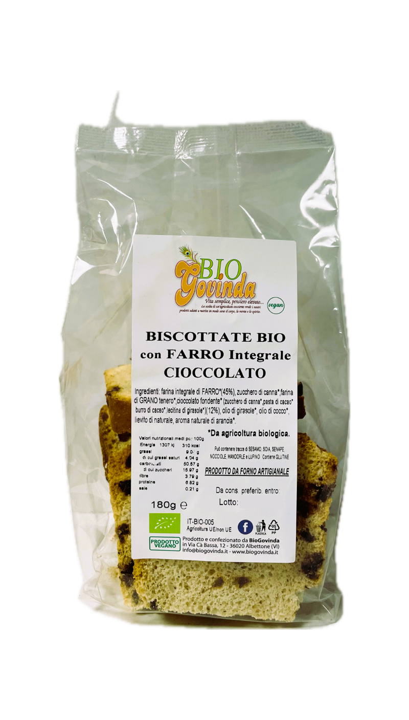 Fette Biscottate con Farro integrale arricchite con gocce di Cioccolato fondente, ottime a colazione o per una merenda golosa e salutare.